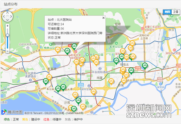 此外,记者在凡骑绿畅公司的官网站点分布地图上看到,南山、福田、大鹏三个区共分布有434个公共自行车站点,其中福田区显示有41个,有16个站点显示可正常运营(包括北大医院站),其他25个站点颜色为黄色,表示正在建设中。