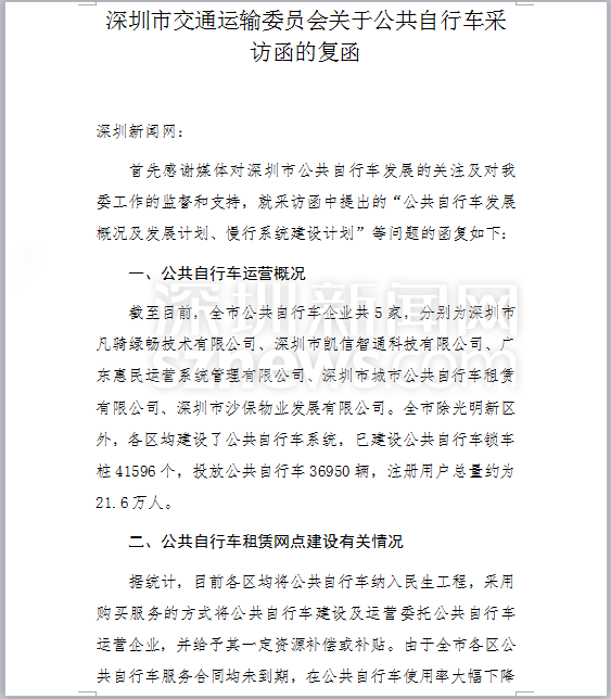 带着这些疑问,记者咨询了深圳市交通运输会。8月22日下午,深圳市交委在回函中介绍了深圳市公共自行车的发展现状,并解答了相关问题。