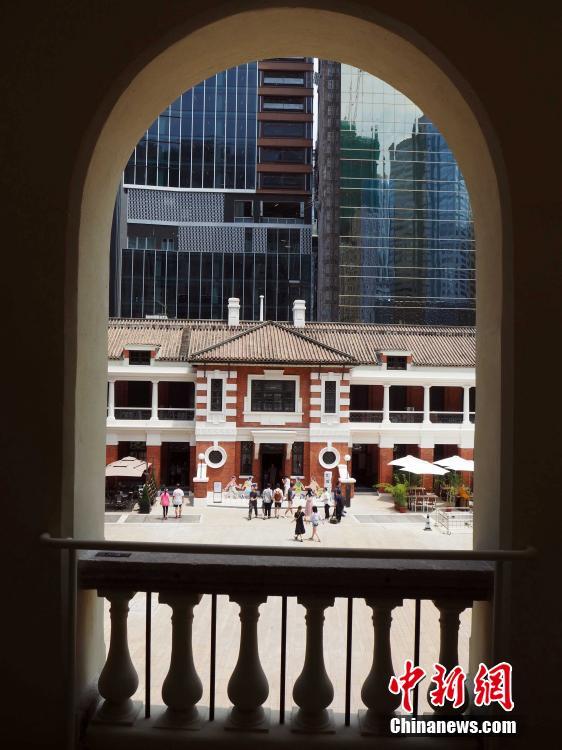 在这座拥有160年历史的中区警署建筑群,从警署总部大楼望向营房大楼,采用西方古典建筑的拱形设计。中新社记者 洪少葵摄