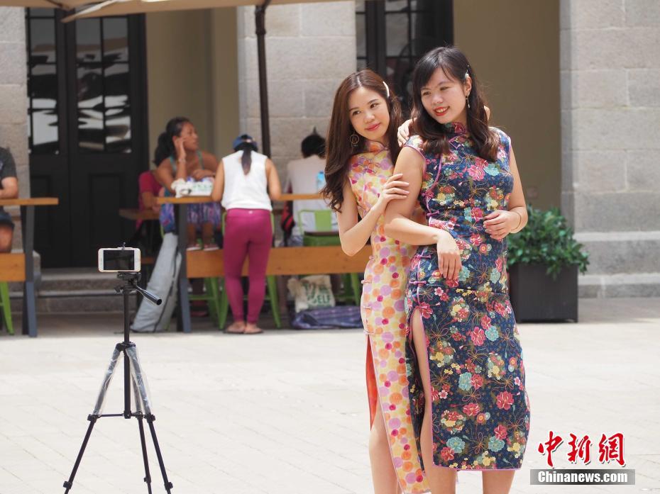 穿著旗袍的女士周日来到“大馆”怀旧一番,尽情拍摄。在2018年5月底重新开幕的“大馆”,既是古迹亦是艺术区,成为港人再多一个节假日好去处。中新社记者洪少葵 摄
