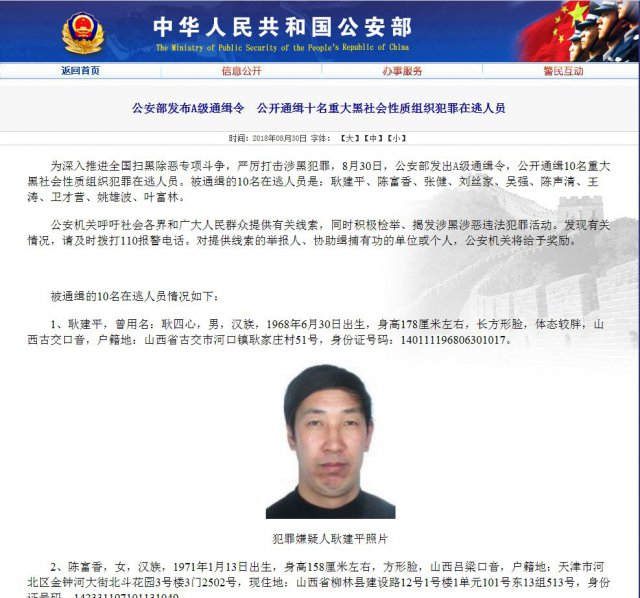 据公安部网站消息,为深入推进全国扫黑除恶专项斗争,严厉打击涉黑犯罪,8月30日,公安部发出A级通缉令,公开通缉10名重大黑社会性质组织犯罪在逃人员。被通缉的10名在逃人员是:耿建平、陈富香、张健、刘丝家、吴强、陈声清、王涛、卫才营、姚雄波、叶富林。