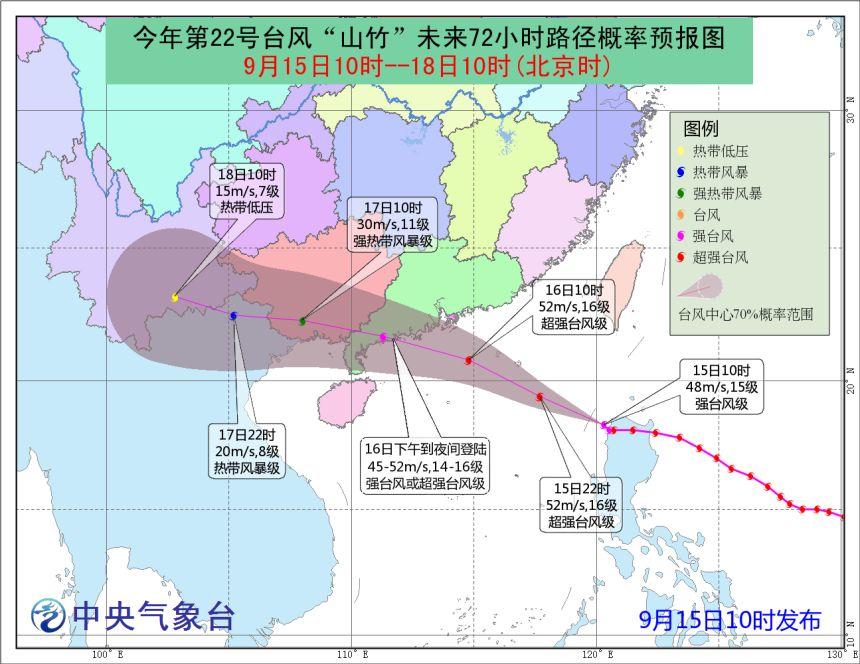 强台风山竹已经进入南海,经过吕宋岛之后,山竹由超强台风减弱至强台风,10时中心附近风力15级,距离深圳约800公里,7级风圈距深圳约500公里。