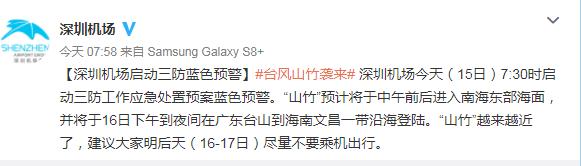 #台风山竹袭来# 深圳机场今天(15日)7:30时启动三防工作应急处置预案蓝色预警。“山竹”预计将于中午前后进入南海东部海面,并将于16日下午到夜间在广东台山到海南文昌一带沿海登陆。“山竹”越来越近了,建议大家明后天(16-17日)尽量不要乘机出行。(@深圳机场)