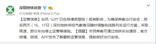 台风 “山竹”已在菲律宾登陆!受其影响,为确保乘客出行安全,明后两天(16、17日)深圳地铁将视气象情况随时调整各线路列车运行方案,采取限速、部分车站停止运营等措施。