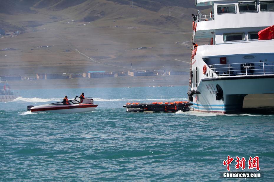 9月20日,青海湖2018年水上联合应急搜救演练在二郎剑景区附近水域举行。本次演练历时90分钟,共有33艘船艇,200余人参加。图为游客转载演练。中新社记者 罗云鹏 摄
