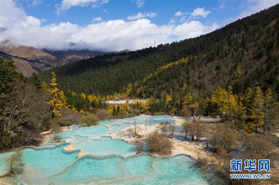 蓝天白云与彩林、彩池构成一幅美丽画卷(10月19日无人机拍摄)。深秋时节,在雪山、蓝天、白云和彩林映衬下,黄龙沟中的彩池色彩更加斑斓,目前黄龙景区进入观赏最佳时节。黄龙风景名胜区位于四川省松潘县境内,以彩池、滩流、雪山、峡谷、森林等闻名,享有“人间瑶池”“圣地仙境”之美誉。新华社记者江宏景摄
