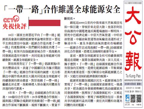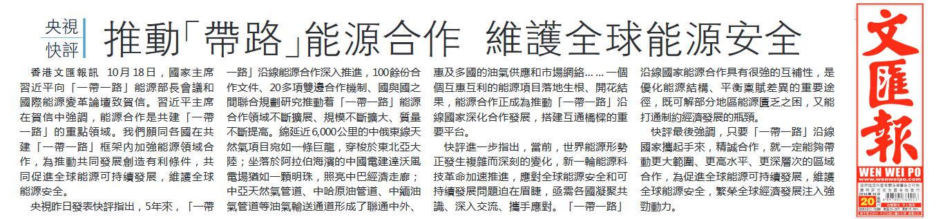 央视网消息:10月20日,香港《大公报》和香港《文汇报》同时转发了中央广播电视总台央视新闻19日刊播的《央视快评:推动“一带一路”能源合作 维护全球能源安全》。报道内容如下: