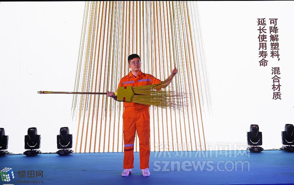 环卫工人代表现场展示新型环卫工具,图中展示的新型扫把具备轻便、耐用、安全等特点。