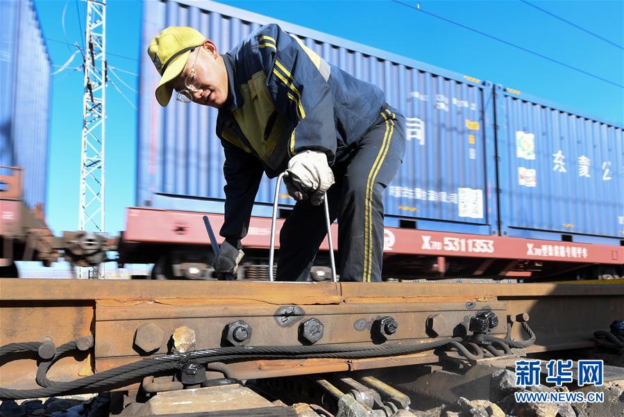 11月8日,福生庄养路工区的职工在对钢轨进行垫高作业。新华社记者刘磊摄