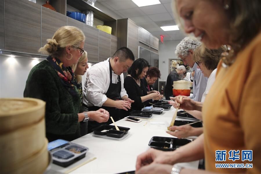11月19日,在美国纽约梅西百货商场,活动参与者在上海美食节美食课堂上学做小笼包。新华社记者王迎摄