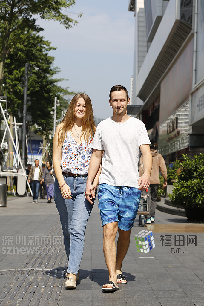 俄罗斯情侣身穿背心牛仔裤与短袖短裤,明亮的蓝色依然是夏天的感觉。