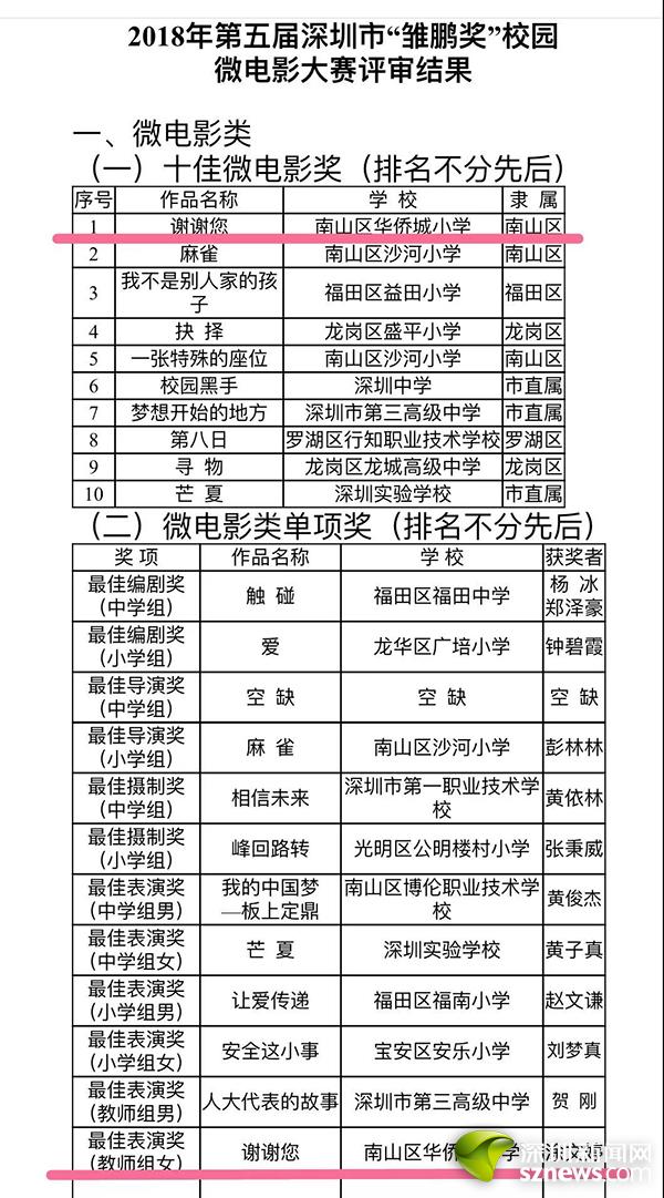 深圳新闻网讯(记者王志明)刚结束的2018年深圳市第五届“雏鹏奖”校园微电影大赛传来喜讯:深圳市南山区华侨城小学首部毕业季微电影《谢谢您》,从深圳市中小学245部参赛作品中脱颖而出,入选“十佳微电影”;同时本片还获得大赛的最佳表演奖。
