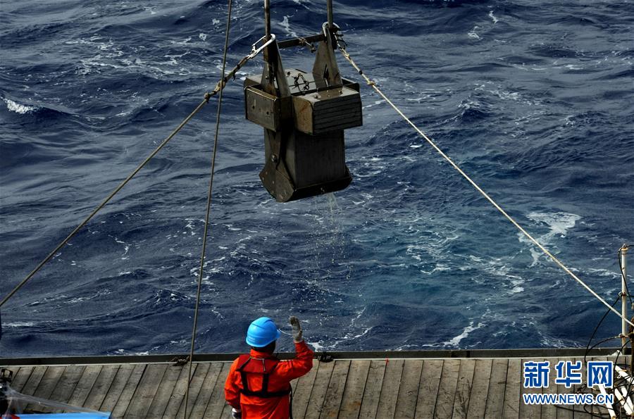 科考团队成员在船上布放箱式采样器(12月19日摄)。