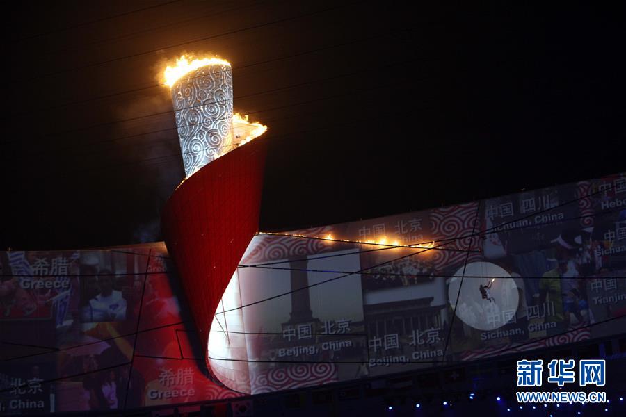 图为2008年8月8日,最后一棒火炬手李宁在北京奥运会开幕式上点燃主火炬。新华社记者姚大伟摄