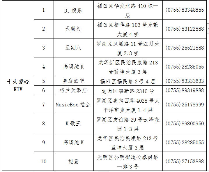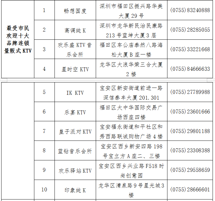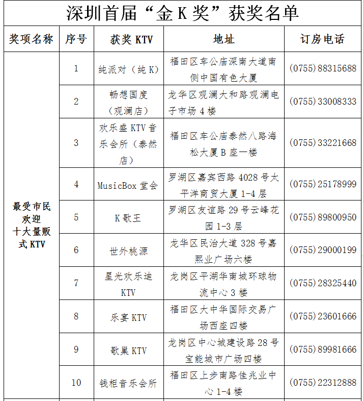 深圳新闻网12月29日讯(记者 邓涛)今年9月,由深圳市文体旅游局指导、深圳市文化市场行业协会协会主办,深圳新闻网支持的首届“金K奖”系列评选活动,经三个月的企业自荐、政府协会推荐、专家审核和实地考察等多个环节,最终评选出“最受市民欢迎十大量贩式KTV”、“最受市民欢迎十大品牌连锁量贩式KTV”、“十大爱心KTV”三大获奖名单。记者从名单看到,三项“十大”KTV主要分布在福田、龙华、龙岗、宝安等区域。其中,最受市民欢迎十大品牌连锁量贩式KTV在深圳共有连锁分店44家,约占全市正常营业场所的8%,各品牌分店分布全市,总有一家在你附近。