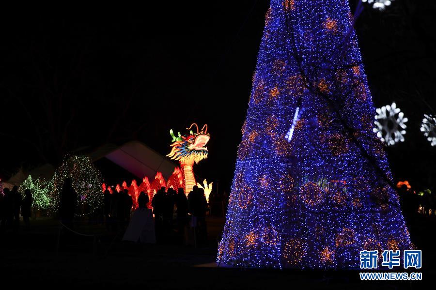 12月30日,在美国纽约斯塔滕岛举行的冬季花灯节上,巨龙与圣诞树造型的花灯遥相辉映。新华社记者王迎摄