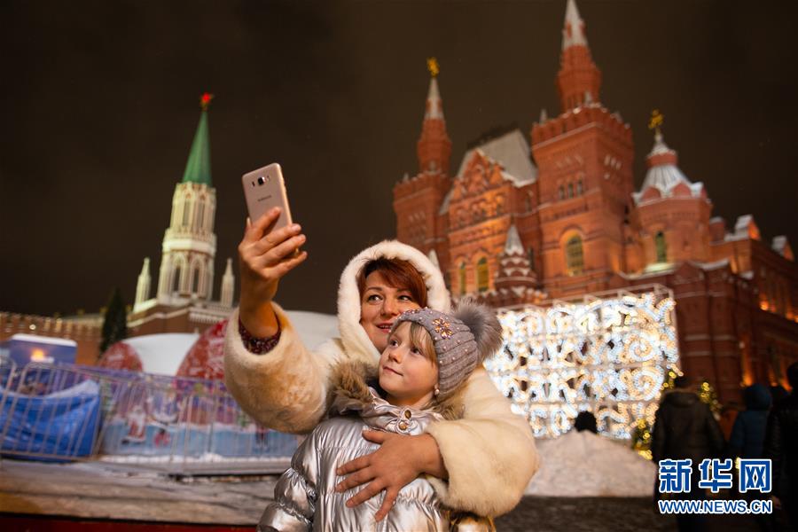 2018年12月31日,在俄罗斯首都莫斯科,人们在迎新年活动中自拍。新华社发(叶夫根尼·西尼岑摄)