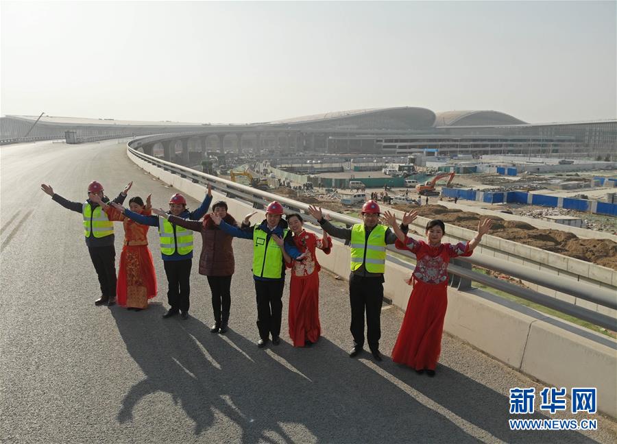 1月1日,在北京大兴国际机场航站楼前,新人们合影留念(无人机拍摄)。当日,中建三局三公司北京大兴国际机场项目部为四对员工举办了一场朴素而温馨的工地新年集体婚礼。新华社记者才扬摄