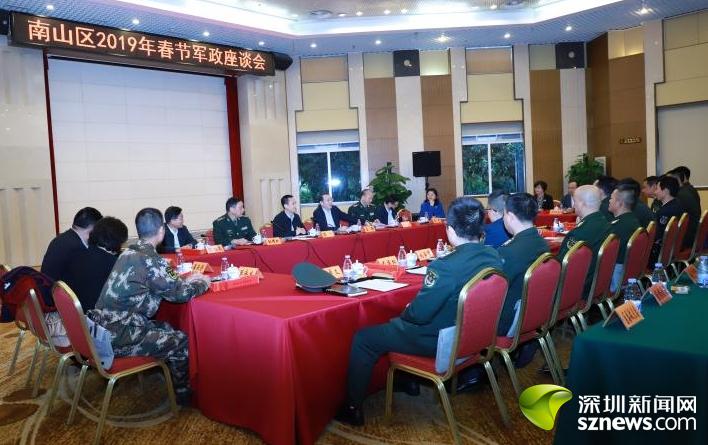 深圳新闻网讯(记者 曹文丽)南山历来有拥军优属、拥政爱民的优良传统。为了在新的一年进一步做好双拥工作,更好地服务部队建设,1月29日下午,南山区2019年春节军政座谈会在荔香居召开,深圳警备区副司令喻晓,南山区委书记王强,区委副书记、区长曾湃,区人大常委会主任麦林光,区政协主席陈军,区委常委彭耀玖、胡芸,副区长谢炳文以及所有驻区部队首长出席了座谈会。