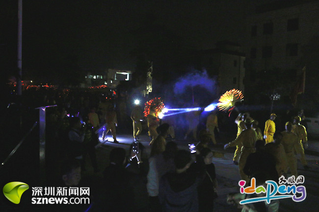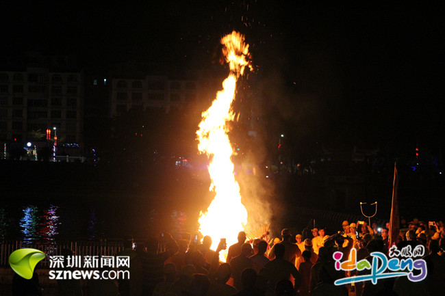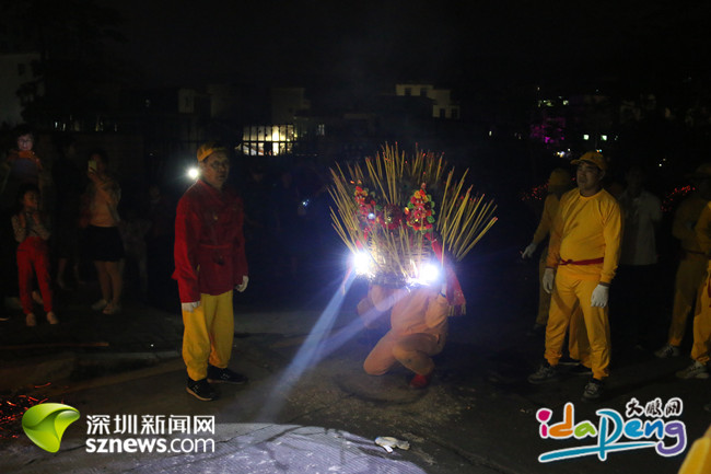 “起龙咯!”年初二晚7点,随着舞草龙传承人何叔的一声吆喝,令旗舞动,舞龙队员们欢呼,锣鼓声震天,长串鞭炮炸响,火光闪闪,冲天轰鸣。接着,何叔高擎火龙头,向着天后庙俯首三拜,南澳街灯顿时熄灭;黑暗中,龙头两眼射出高光,龙须飘逸,龙身点燃的香火闪亮,形成一条长长的火龙。焰火闪闪的火龙伴着锣鼓声,且舞且进,浩浩荡荡,火龙所到之处,南澳居民以礼迎接。