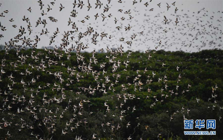 2月17日,来到东寨港国家级自然保护区越冬的鸟类在天空飞翔。近日,海南东寨港国家级自然保护区出现“鸟浪”景观。据工作人员介绍,自然保护区良好的生态环境吸引了数万只椋鸟前来越冬,“鸟浪”主要由黑领椋鸟、灰背椋鸟、丝光椋鸟等组成。新华社记者杨冠宇摄