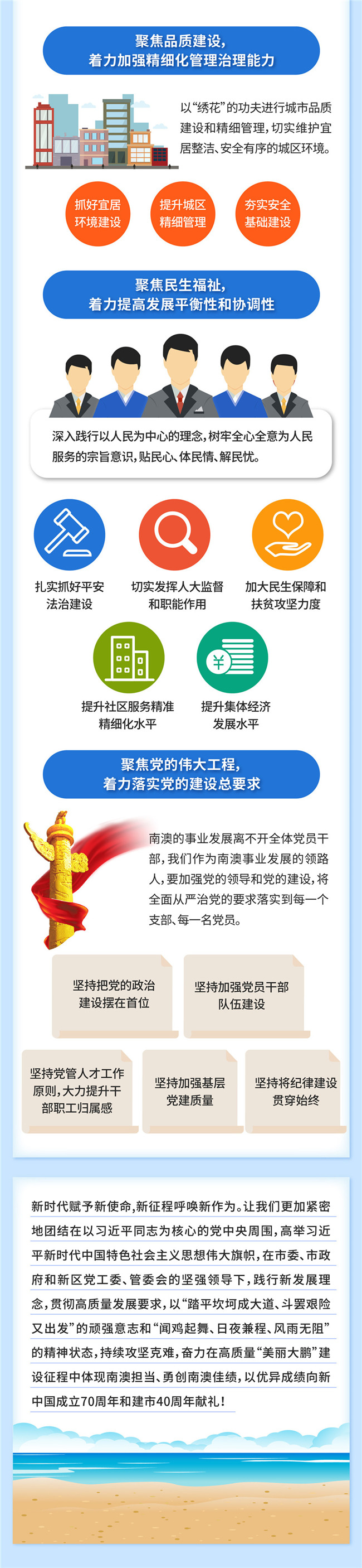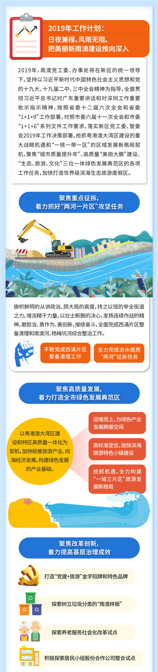 今年,南澳党工委、办事处将落实新区党工委、管委会2019年工作决策部署,抢抓粤港澳大湾区建设的重大战略机遇和“一核一带一区”的区域发展新格局契机,聚焦“城市质量提升年”、高质量“美丽大鹏”建设、“生态、旅游、文化”三位一体绿色发展典范区的各项工作任务,加快打造世界级滨海生态旅游度假区。