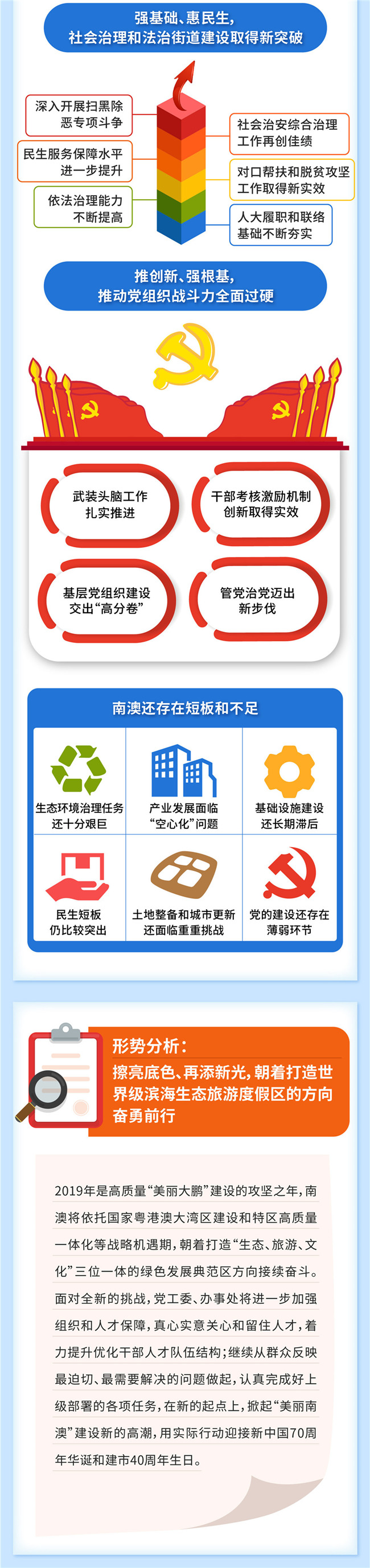 记者了解到,过去一年,南澳党工委、办事处在市委、市政府和新区党工委、管委会的坚强领导下,抢抓粤港澳大湾区建设的战略机遇期,围绕高质量“美丽大鹏”建设的总要求,攻坚克难,勇于担当,出色完成了“两村四河一片区”、打造全市首个“零工业”街道等重难点工作任务。