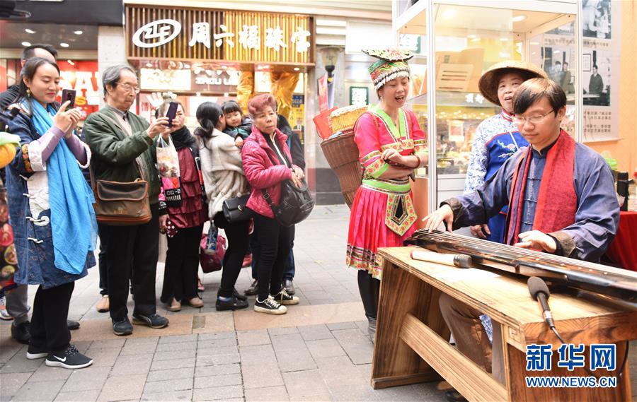 2月25日,游人在庙会上观看艺术家表演。当日,为期7天的2019广府庙会在广州闭幕。广府庙会通过文化的交融与碰撞,体现了广府文化“兼容并蓄”的特质,并让传统文化得到传承和弘扬。新华社记者何璐璐 摄