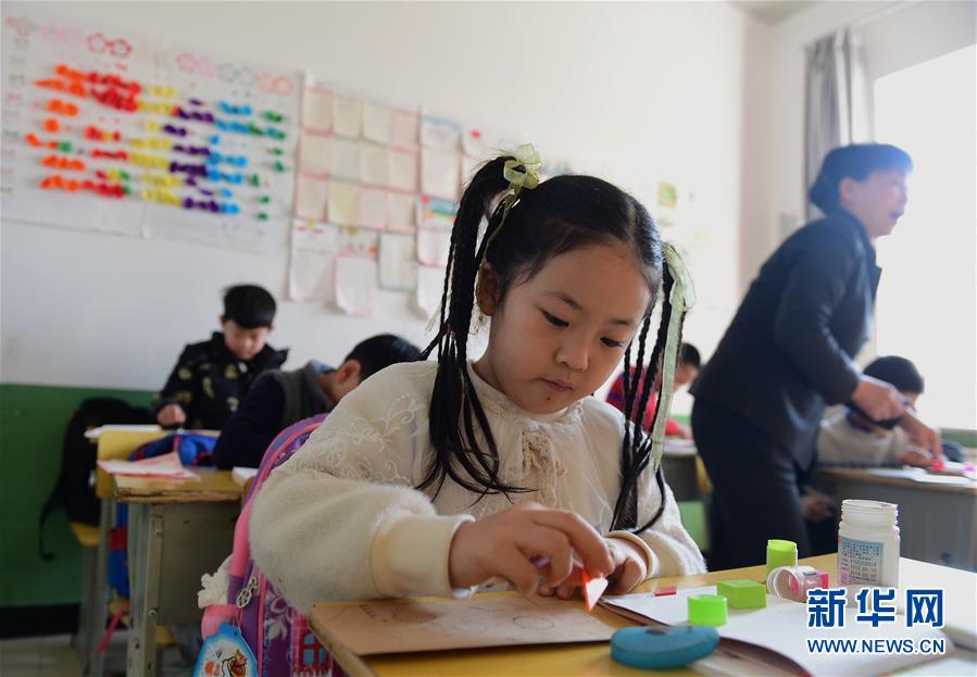 2月25日,荒沟庙村教学点学生在手工课上。当日,吉林省桦甸市二道甸子镇荒沟庙村教学点迎来开学日。位于大山深处的荒沟庙村教学点目前有4名教师,只有由5名二年级学生和2名学前儿童组成的一个复式班。教学点虽小,数字教学设备、取暖设备、课余活动器材等设施一应俱全。新华社记者林宏 摄