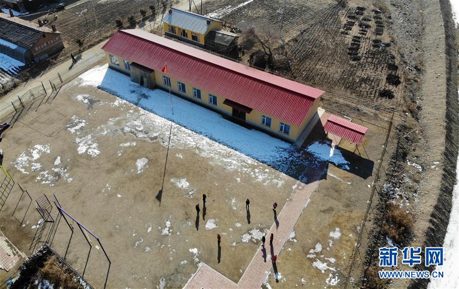 2月25日,荒沟庙村教学点学生在操场上活动(无人机拍摄)。当日,吉林省桦甸市二道甸子镇荒沟庙村教学点迎来开学日。位于大山深处的荒沟庙村教学点目前有4名教师,只有由5名二年级学生和2名学前儿童组成的一个复式班。教学点虽小,数字教学设备、取暖设备、课余活动器材等设施一应俱全。新华社记者林宏 摄