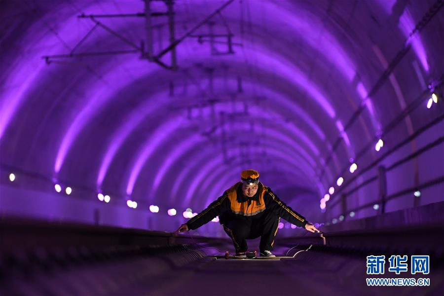 2月28日凌晨,西安电务段鄠邑电务车间信号工王超在西成高铁纸坊一号隧道里进行轨道电路测试。新华社记者李一博摄