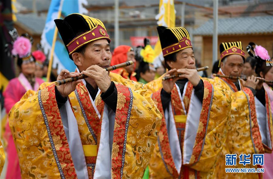 2月28日,民间艺人在陕西蓝田水陆庵古庙会上表演国家级非遗项目——蓝田普化水会音乐。当日是农历正月二十四,陕西西安蓝田县水陆庵古庙会上人头攒动,古老淳朴的庙会吸引众多当地群众及游客前来参加。新华社记者刘潇摄