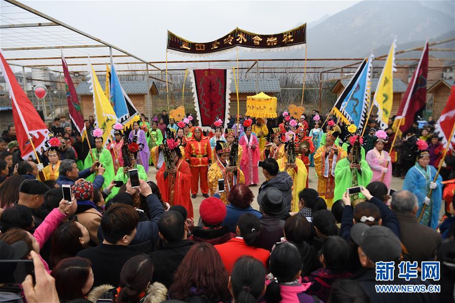 2月28日,社区文艺队在陕西蓝田水陆庵古庙会上表演。当日是农历正月二十四,陕西西安蓝田县水陆庵古庙会上人头攒动,古老淳朴的庙会吸引众多当地群众及游客前来参加。新华社记者刘潇摄