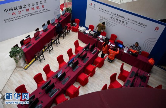 2月27日,工作人员在全国两会新闻中心通信网络服务室忙碌。当日,在2019年全国两会即将召开之际,设在北京西长安街北侧梅地亚中心的两会新闻中心正式启用。十三届全国人大二次会议和全国政协十三届二次会议将分别于3月5日和3月3日在北京开幕。新华社记者陈晔华摄