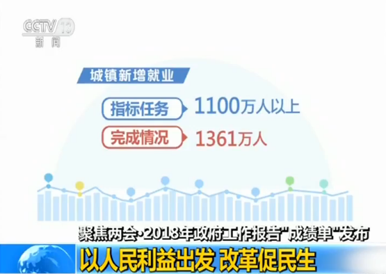 经济指标完成任务,民生承诺兑现更增加了百姓的获得感。去年《政府工作报告》承诺了城镇新增就业1100万人以上的目标,实际全年城镇新增就业1361万人,城镇失业率更是控制在4.8%到5.1%,低于指标任务5.5%。一直被百姓诟病的移动网络流量资费过高的问题,也在2018年得到有效解决,年末全国移动网络流量平均资费较上年末下降了63%,加倍完成了政府工作报告中降低30%的承诺。