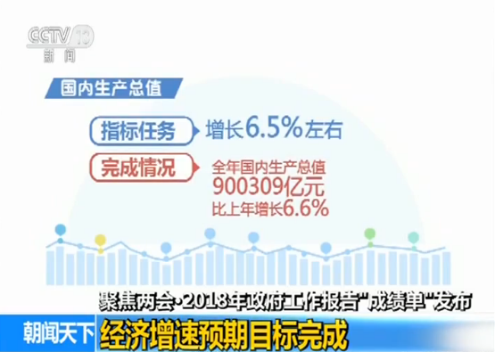 去年两会上《政府工作报告》提出,2018年的预期目标是国内生产总值增长6.5%左右。事实上,据初步核算,2018全年国内生产总值900309亿元,比上年增长6.6%。我国GDP总量首次站上90万亿元的高位。此外,政府工作报告提出居民消费价格涨幅控制在3%左右,而实际涨幅为2.1%,仍在合理区间运行。
