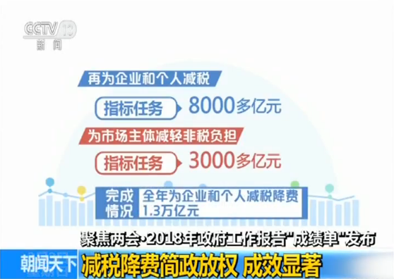 去年政府工作报告提出,2018年全年再为企业和个人减税8000多亿元,为市场主体减轻非税负担3000多亿元。而实际全年共为企业和个人减税降费1.3万亿元。减税降费的红利实实在在落在了企业和个人的钱袋子里。同时,简政放权的力度也在扩大,企业开办时间和工程建设项目审批时间都实现了压减一半的目标,各大中心城市开办企业所需时间基本在5-8个工作日。