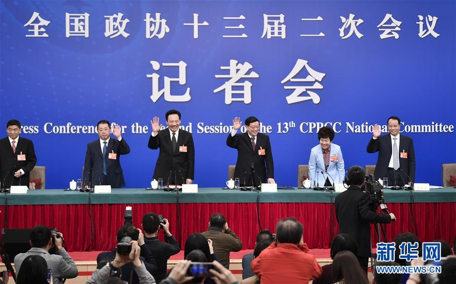 3月5日,全国政协十三届二次会议新闻中心举行记者会,邀请全国政协委员李伟、秦博勇、陈雨露、王培安、刘炳江谈打赢防范化解重大风险、精准脱贫、污染防治三大攻坚战。新华社记者王鹏摄