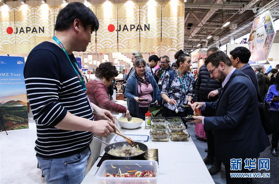 3月6日,在德国首都柏林,参观者在2019柏林国际旅游交易会的韩国展区品尝韩国美食。新华社记者单宇琦 摄