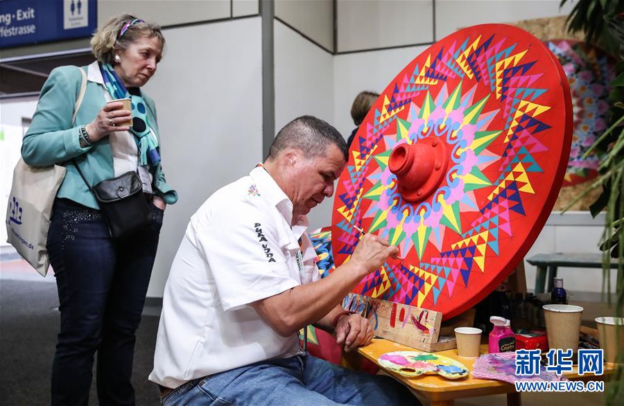 3月6日,在德国首都柏林,一名哥斯达黎加展区的工作人员在2019柏林国际旅游交易会上绘制工艺品。新华社记者单宇琦 摄