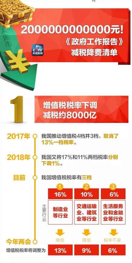 央视网消息:今年的政府工作报告指出,全年将减轻企业税收和社保缴费负担近2万亿元。这2万亿元主要将会降在哪里?哪些行业减税降费比较多?一张图告诉你↓