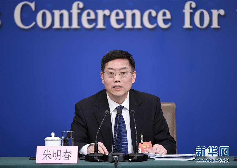 3月10日,十三届全国人大二次会议新闻中心举行记者会,邀请全国人大监察和司法委员会副主任委员徐显明、全国人大财政经济委员会副主任委员尹中卿、全国人大教育科学文化卫生委员会副主任委员吴恒、全国人大环境与资源保护委员会副主任委员窦树华和全国人大常委会预算工作委员会副主任朱明春就“人大监督工作”相关问题回答中外记者提问。这是朱明春在回答记者提问。新华社记者王鹏摄