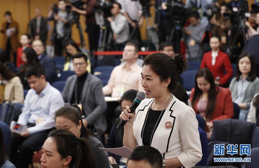 3月10日,十三届全国人大二次会议新闻中心举行记者会,邀请全国人大监察和司法委员会副主任委员徐显明、全国人大财政经济委员会副主任委员尹中卿、全国人大教育科学文化卫生委员会副主任委员吴恒、全国人大环境与资源保护委员会副主任委员窦树华和全国人大常委会预算工作委员会副主任朱明春就“人大监督工作”相关问题回答中外记者提问。这是记者在提问。新华社记者沈伯韩摄
