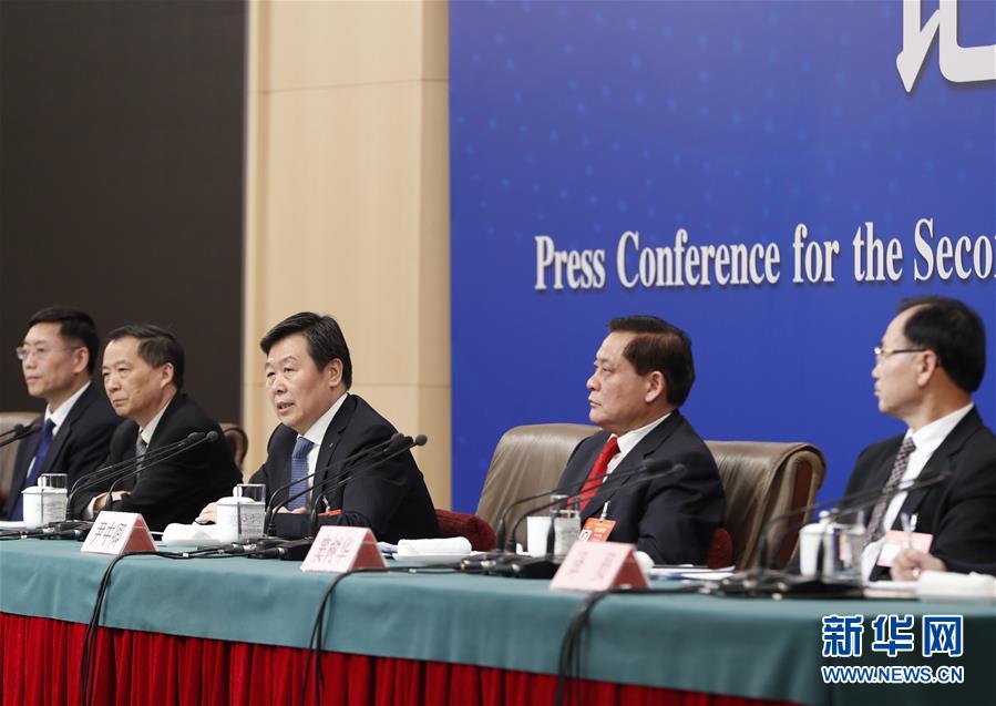 3月10日,十三届全国人大二次会议新闻中心举行记者会,邀请全国人大监察和司法委员会副主任委员徐显明、全国人大财政经济委员会副主任委员尹中卿、全国人大教育科学文化卫生委员会副主任委员吴恒、全国人大环境与资源保护委员会副主任委员窦树华和全国人大常委会预算工作委员会副主任朱明春就“人大监督工作”相关问题回答中外记者提问。这是吴恒(左二)在回答记者提问。新华社记者沈伯韩摄