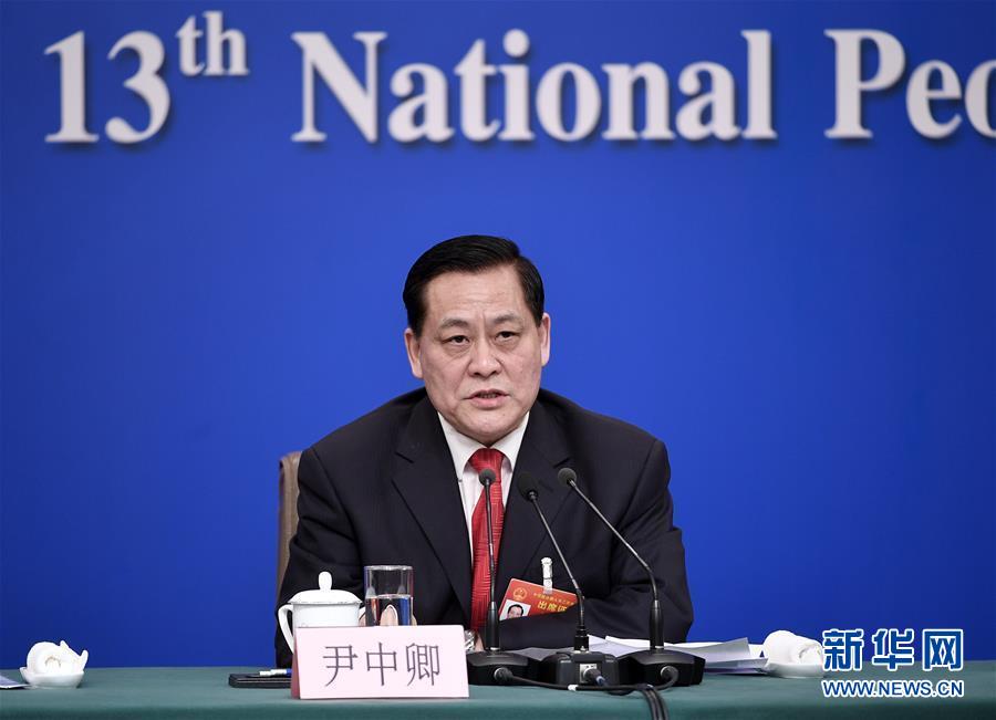 3月10日,十三届全国人大二次会议新闻中心举行记者会,邀请全国人大监察和司法委员会副主任委员徐显明、全国人大财政经济委员会副主任委员尹中卿、全国人大教育科学文化卫生委员会副主任委员吴恒、全国人大环境与资源保护委员会副主任委员窦树华和全国人大常委会预算工作委员会副主任朱明春就“人大监督工作”相关问题回答中外记者提问。这是尹中卿在回答记者提问。新华社记者王鹏摄