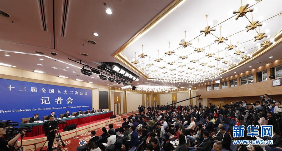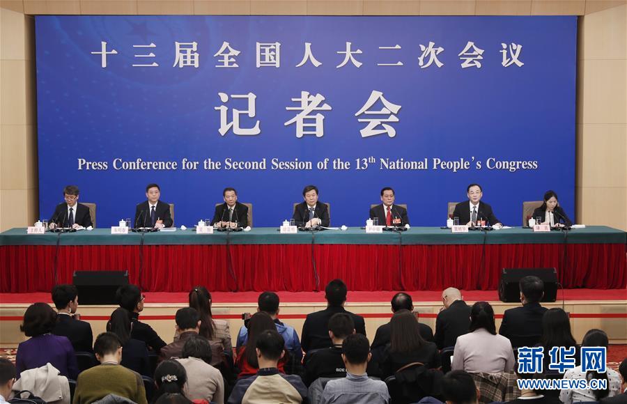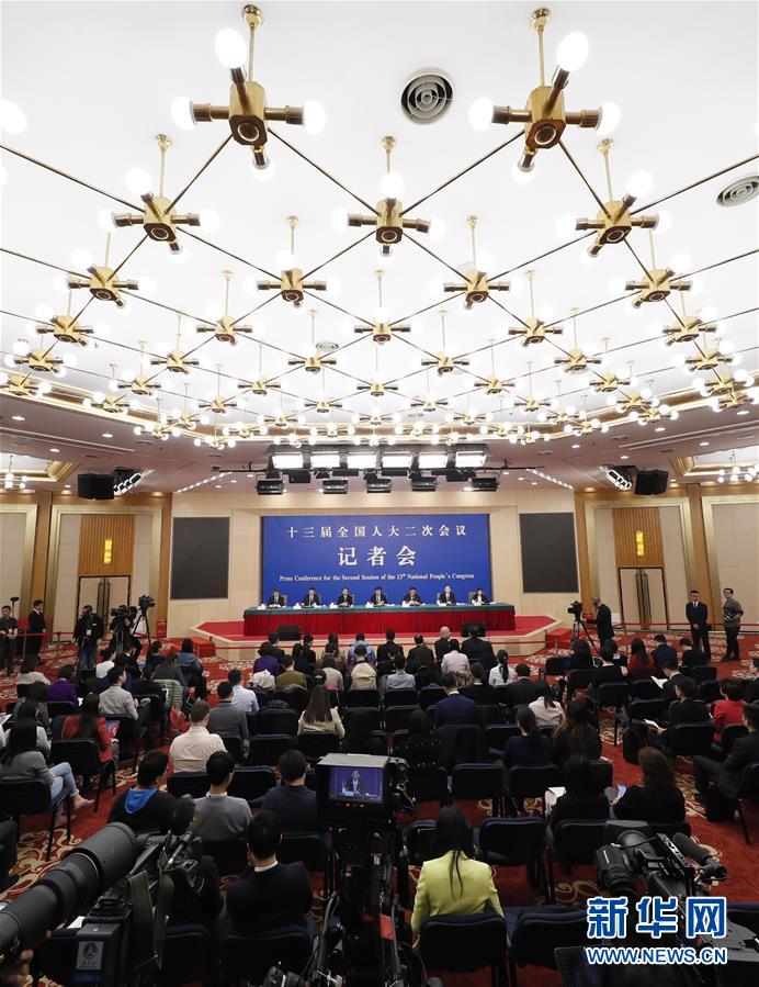 3月10日,十三届全国人大二次会议新闻中心举行记者会,邀请全国人大监察和司法委员会副主任委员徐显明、全国人大财政经济委员会副主任委员尹中卿、全国人大教育科学文化卫生委员会副主任委员吴恒、全国人大环境与资源保护委员会副主任委员窦树华和全国人大常委会预算工作委员会副主任朱明春就“人大监督工作”相关问题回答中外记者提问。新华社记者王鹏摄
