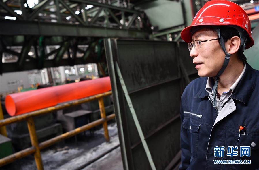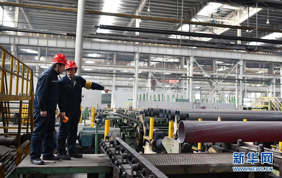 李刚(右)在天津钢管集团股份有限公司巡查生产线(2月20日摄)。