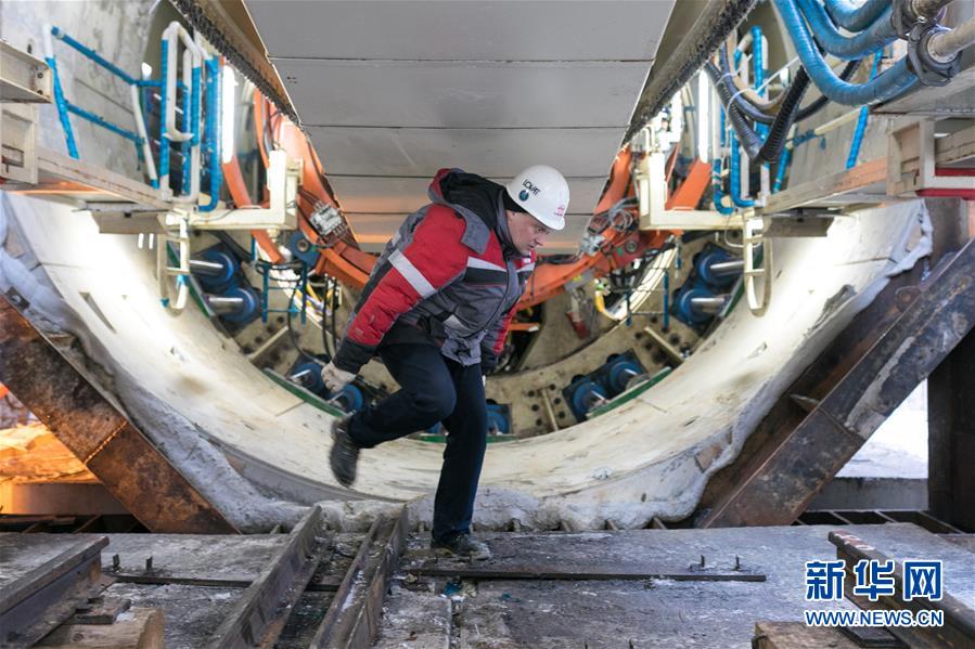 2019年1月25日,在俄罗斯首都莫斯科,施工人员从中国铁建为莫斯科地铁建设工程制造的盾构机内部走过。新华社记者白雪骐摄