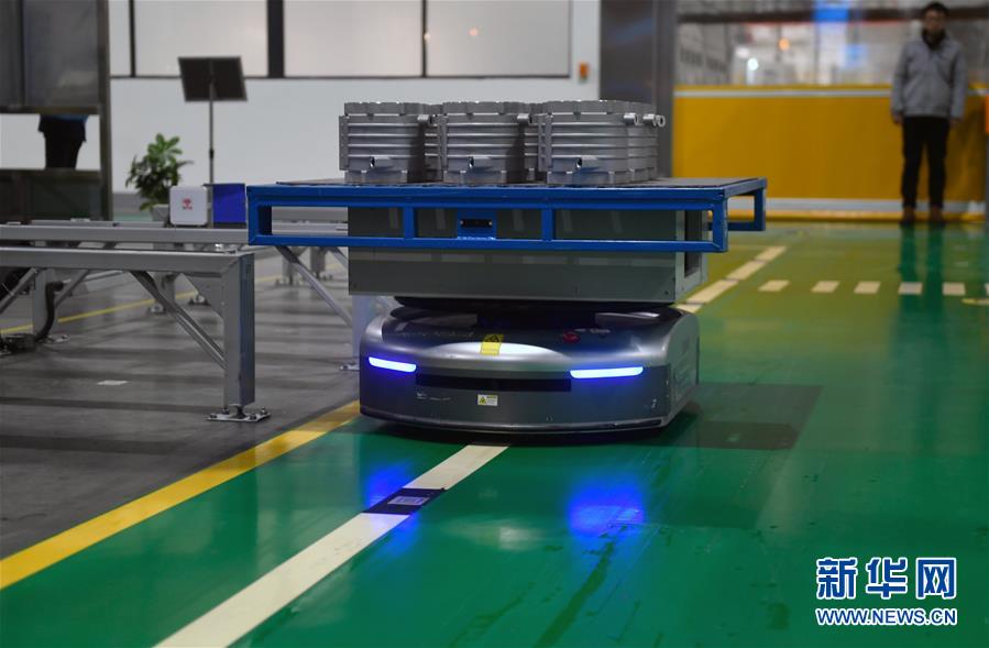 2019年2月15日,一辆智能机器人搬运车在浙江卧龙集团的自动化生产车间穿行。新华社记者黄宗治摄
