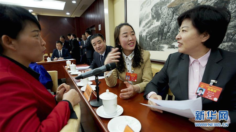3月10日,梁倩娟(右二)与甘肃代表团其他代表交流。甘肃陇南徽县的“80后”全国人大代表梁倩娟2013年从广东回到家乡创业。她开办“陇上庄园”网店,将当地出产的农产品通过网络销售,带动了乡亲们脱贫增收。梁倩娟说:“电商不但改变了我,也实实在在改变了乡亲们的生活,让更多的农特产品走出大山。”梁倩娟希望加大对农村电商人才培训、物流体系建设的支持力度,让农村电商更加成熟,带动更多群众脱贫致富。新华社记者王毓国摄